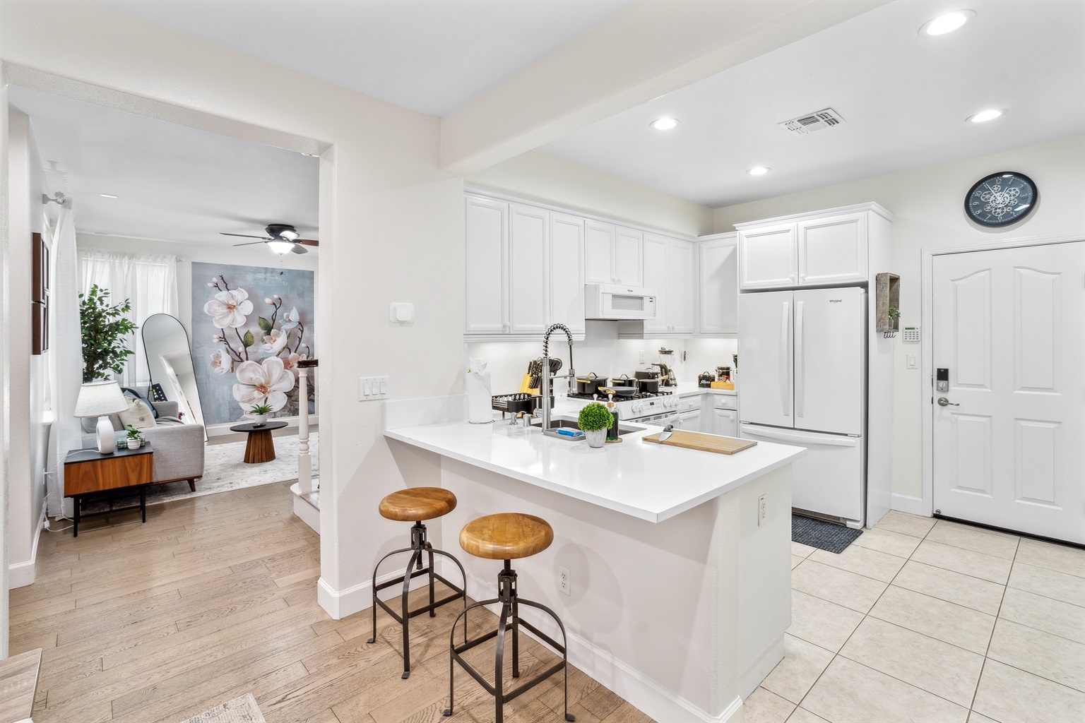 - Modern appliances including refrigerator, microwave and oven