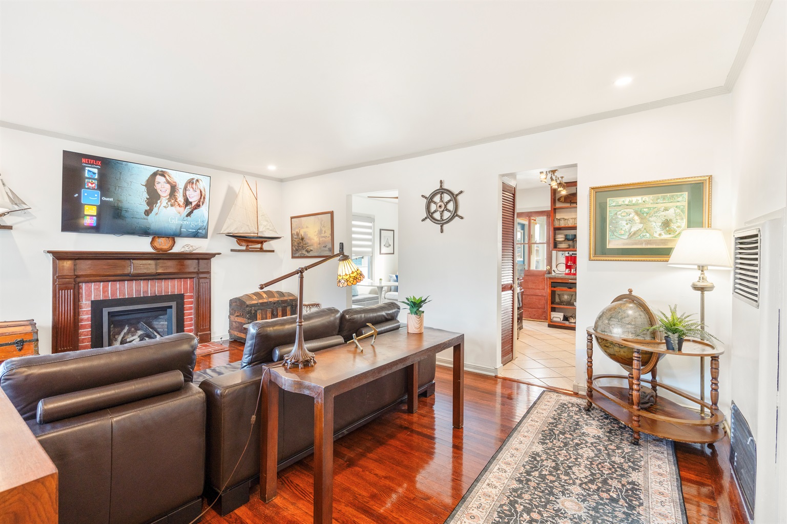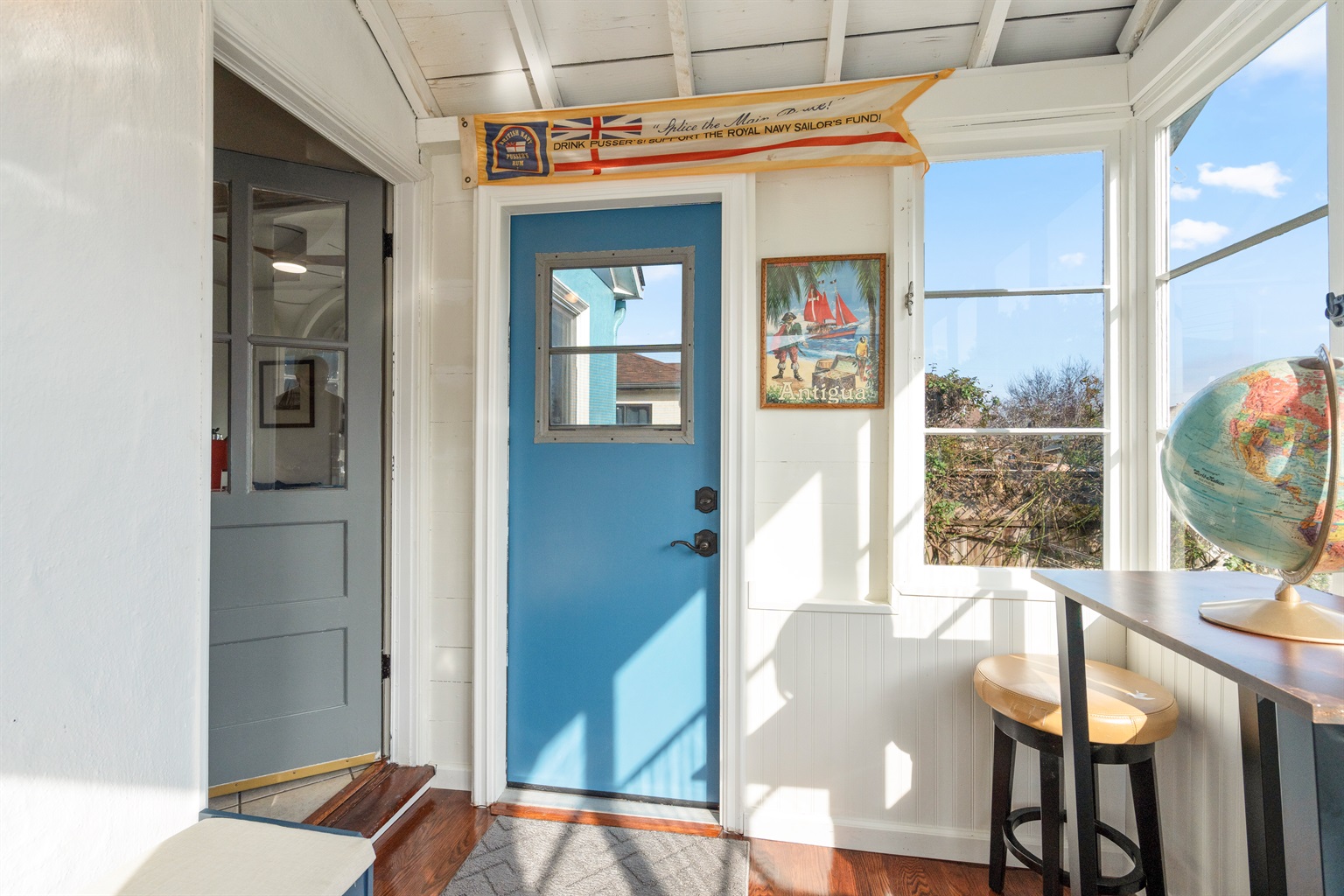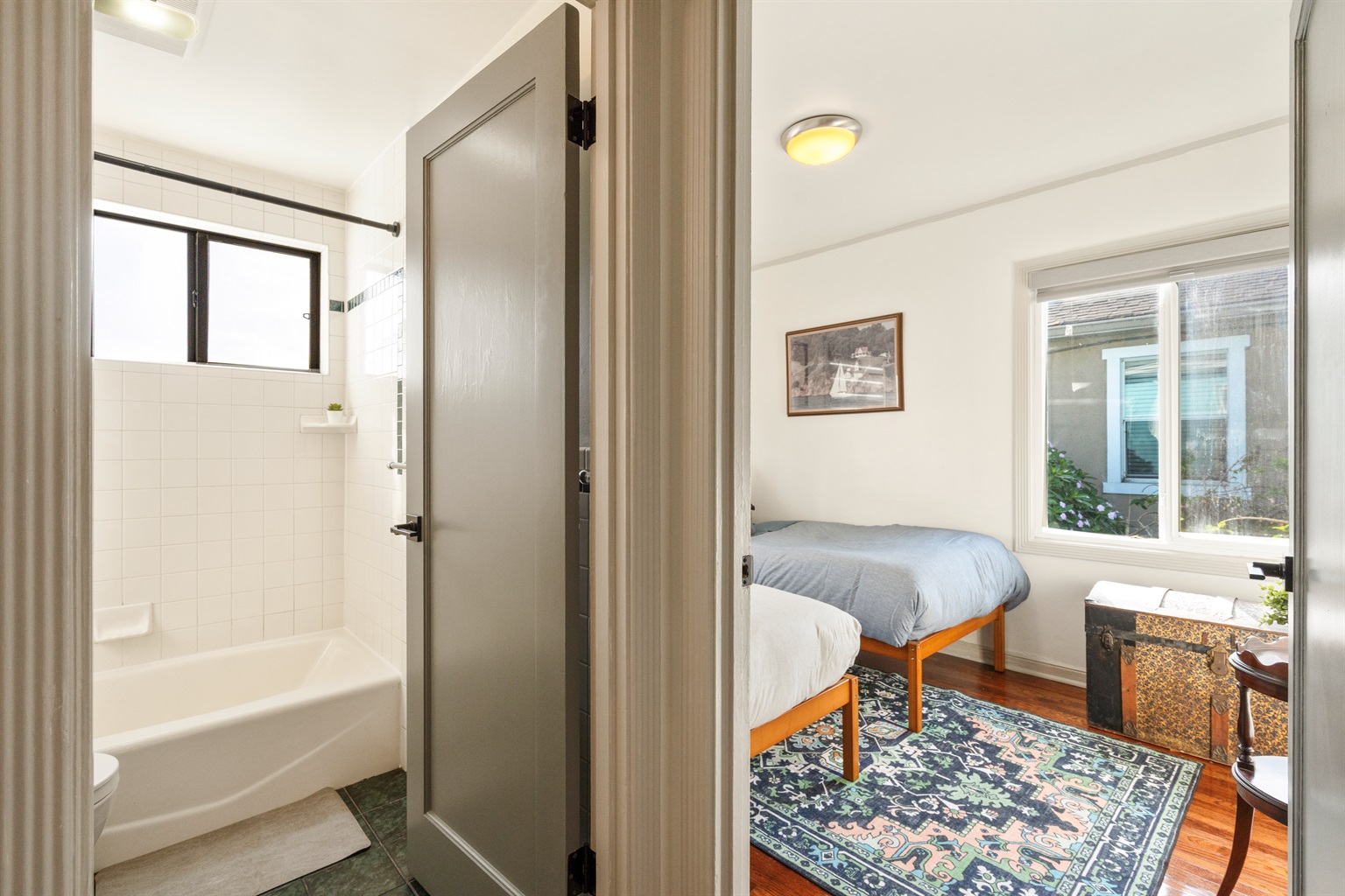 Inside, you’ll find bright, well-appointed living spaces with warm hardwood floors, cozy seating areas, and thoughtfully decorated rooms that balance playful nautical details with everyday comfort. The bedrooms are spacious and inviting, ideal for restful nights after exploring the Bay Area.